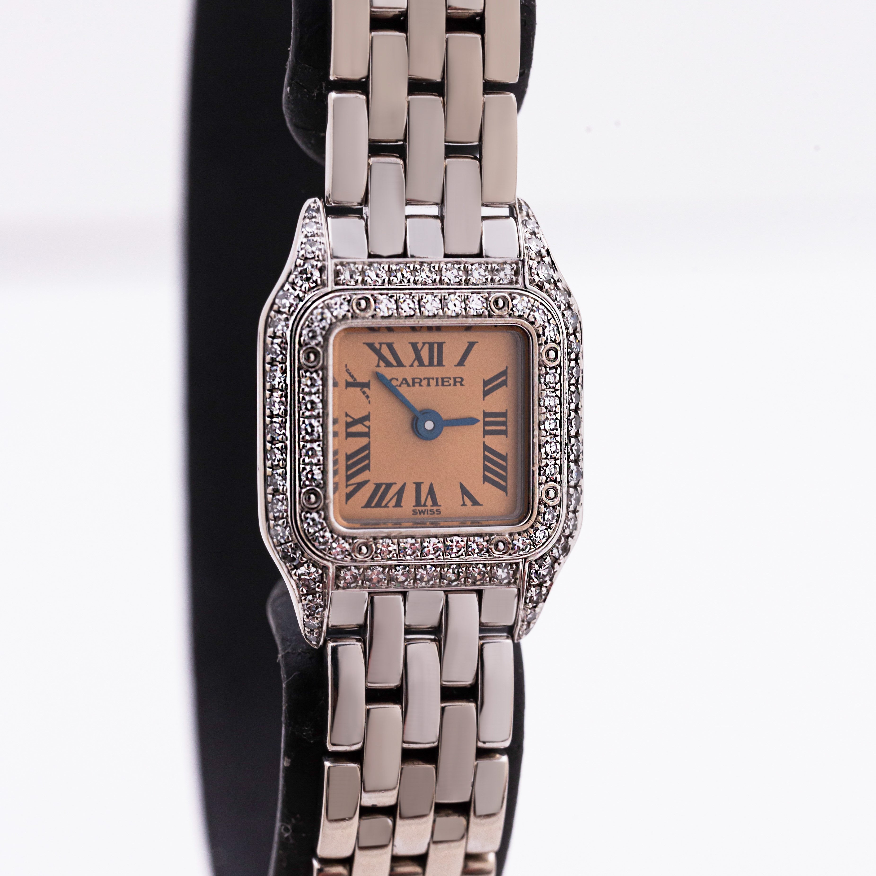 Sublime montre Cartier Panthère Mini Haute Joaillerie en Or blanc 18 carats avec lunette double rang de diamants, cadran saumon et boitier sans couronne latérale, sur son bracelet d'origine et boucle double déployante signée en Or blanc 18 carats