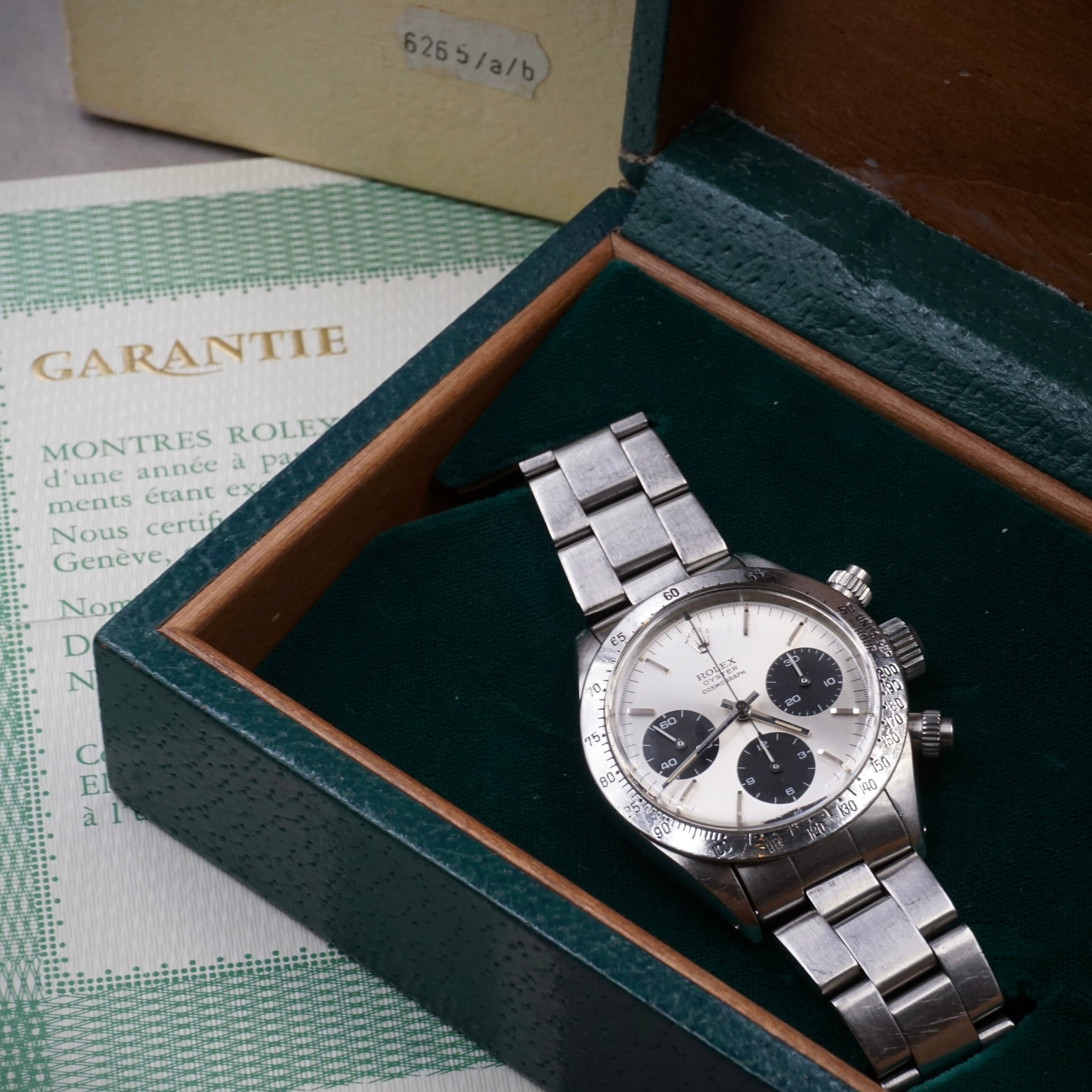 Rarissime et exceptionnel Le chronographe de légende la Rolex Cosmograph Daytona en acier, cadran silver "Sigma" sur bracelet Oyster en acier Ref 6265 avec sa boite et certificat d'origine de 1976.
